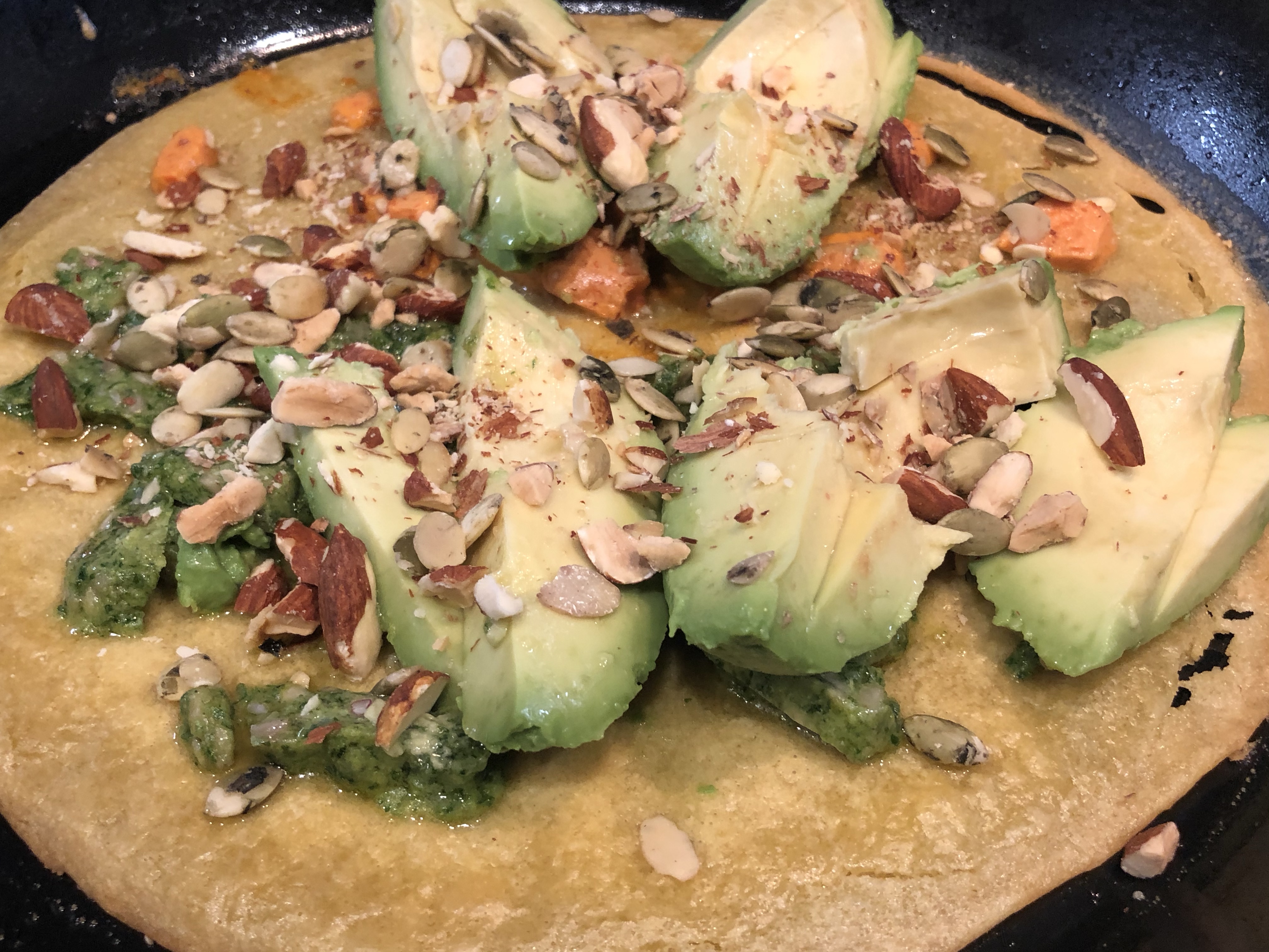 Socca (an unleavened chickpea pancake) topped with parsley vegan pesto, vegan tomato aioli, an avocado seasoned with sea salt and lemon juice, almonds and pumpkin seeds.