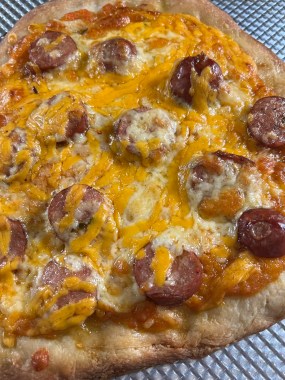 This pizza is topped with chicken sausage, tomato sauce (extra virgin olive oil, tomatoes, onion, garlic, sea salt and pepper), cheddar cheese and mozzarella cheese! Yum! The dough is a recipe from The Bread Bible by Rose Levy Beranbaum.